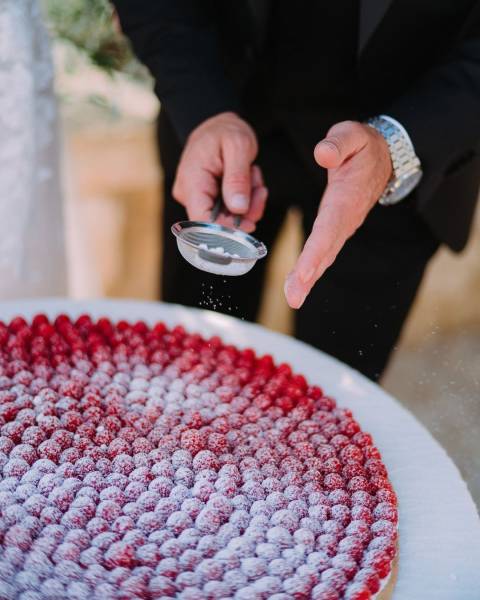 La grande révolution de 2026, c'est l'implication directe des mariés dans la scénographie gourmande. Le dessert n'est plus seulement apporté ; il est achevé sous les yeux de l'assemblée. Cette nouvelle tendance transforme le service en une véritable performance. Les mariés s'avancent vers leur gâteau spectaculaire pour y apporter la touche finale : saupoudrer un nuage de cacao intense sur le tiramisu XXL, ou faire pleuvoir délicatement du sucre glace sur les fruits frais d'une tarte géante.