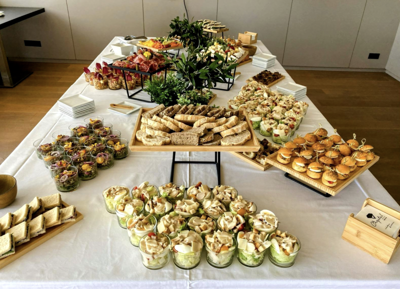 Un cocktail déjeunatoire avec cinq à sept pièces salées par personne, des bodega de salade et une sélection sucrée constitue un repas complet. Vos invités circulent, échangent, sans les contraintes d’un service assis. C’est le format le plus demandé pour les lancements de produit, les réunions interservices ou les afterworks professionnels.